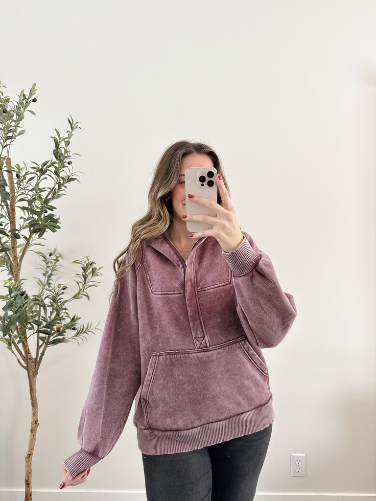 The Laila Pullover is the perfect addition to your winter wardrobe. This half zip hoodie features a beautiful plum color, cute acid wash, and ribbed detailing. Stay cozy and comfortable all season long with this easy to wear pullover.