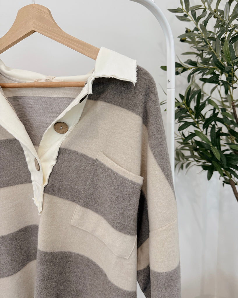 Keep your wardrobe looking playful and unique with our Soft Henley Top. Boasting an ultra-soft exterior, this top also features charming chunky buttons and a raw edge collar for added style. Look cute and feel cozy in this one-of-a-kind piece.